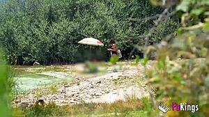 Busty milf almost caught fucking by the river!