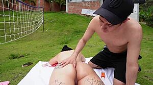 trio teen 18+ doggystyled hard by dirty old man outdoors