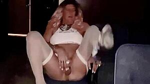 Порноактриса дразнит футджобом в нейлоновых чулках и перчатках