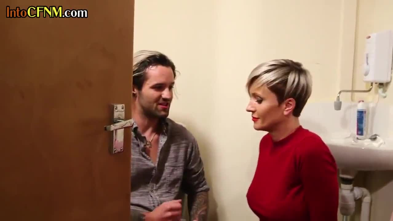 Juicy milf strokes cock in public toilet!
