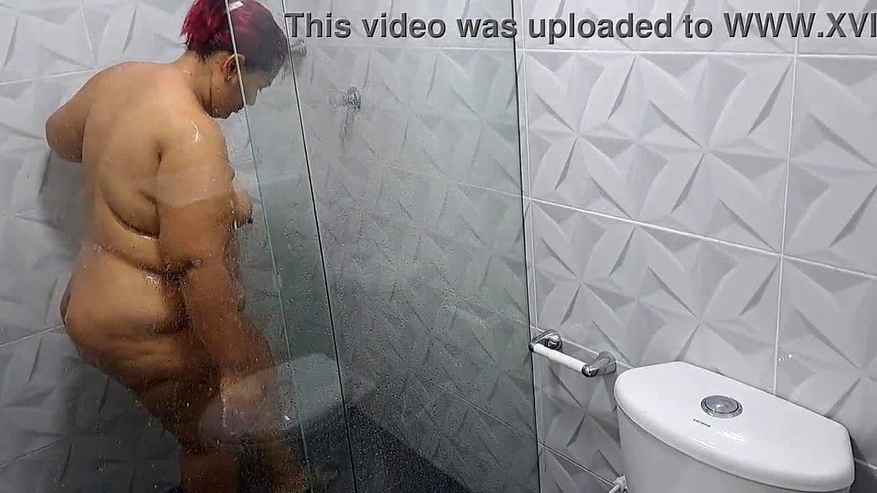 Dicke fette Oma genießt dampfendes Dusch-Moment